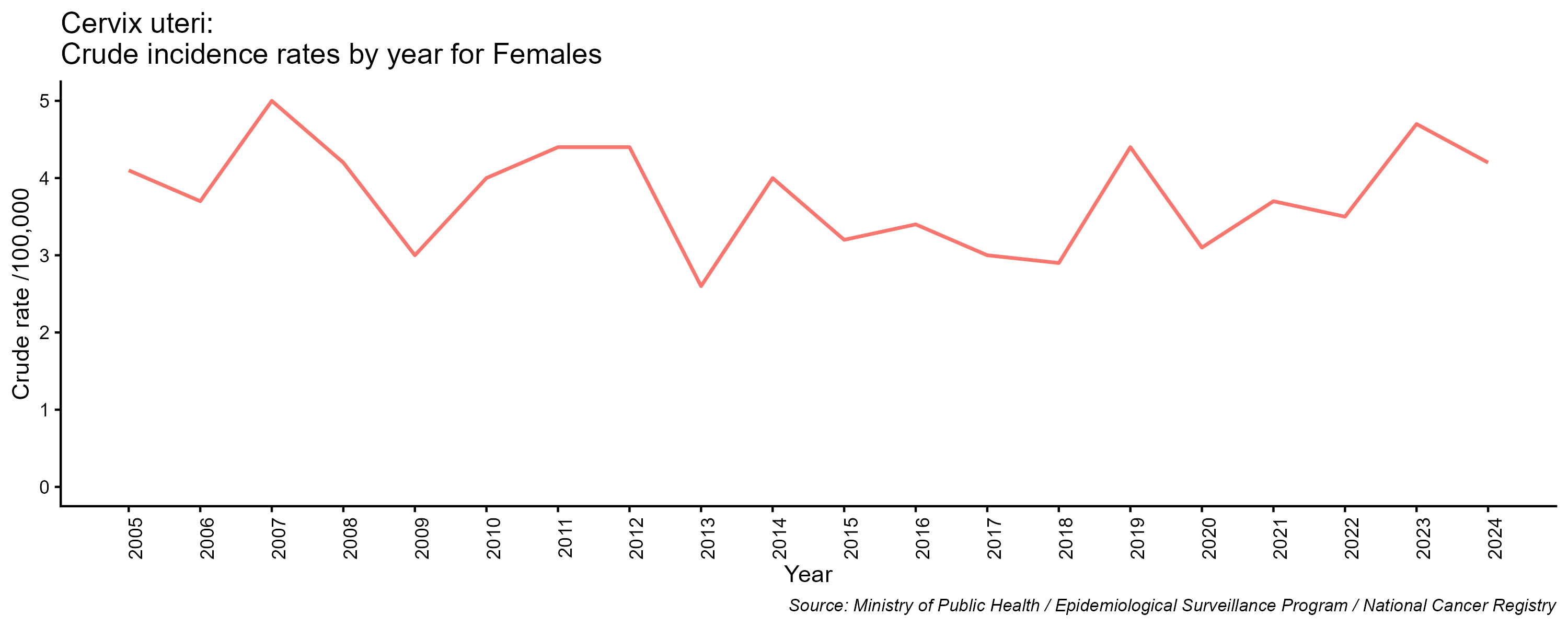 - نسب الحدوث لسرطان عنق الرحم، عند الاناث، 2005-2024
