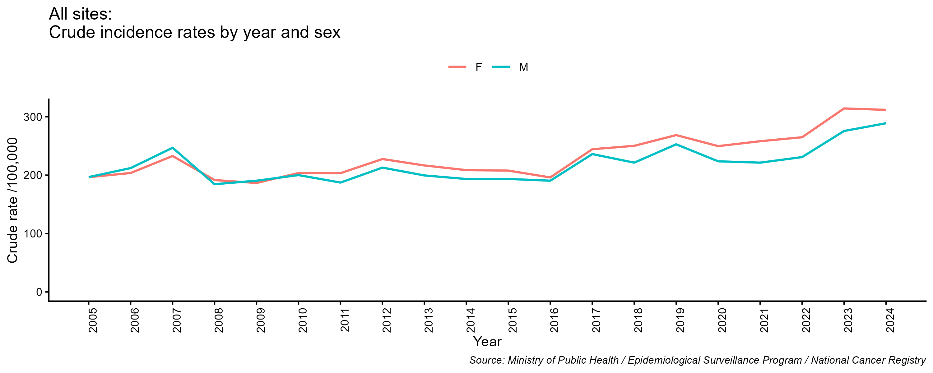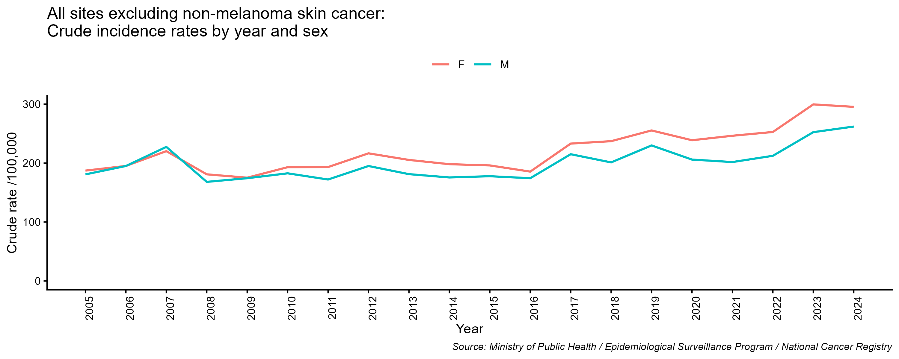 - All cancer excluding non-melanoma skin cancer, crude incidence rate, by year and sex, 2005-2024