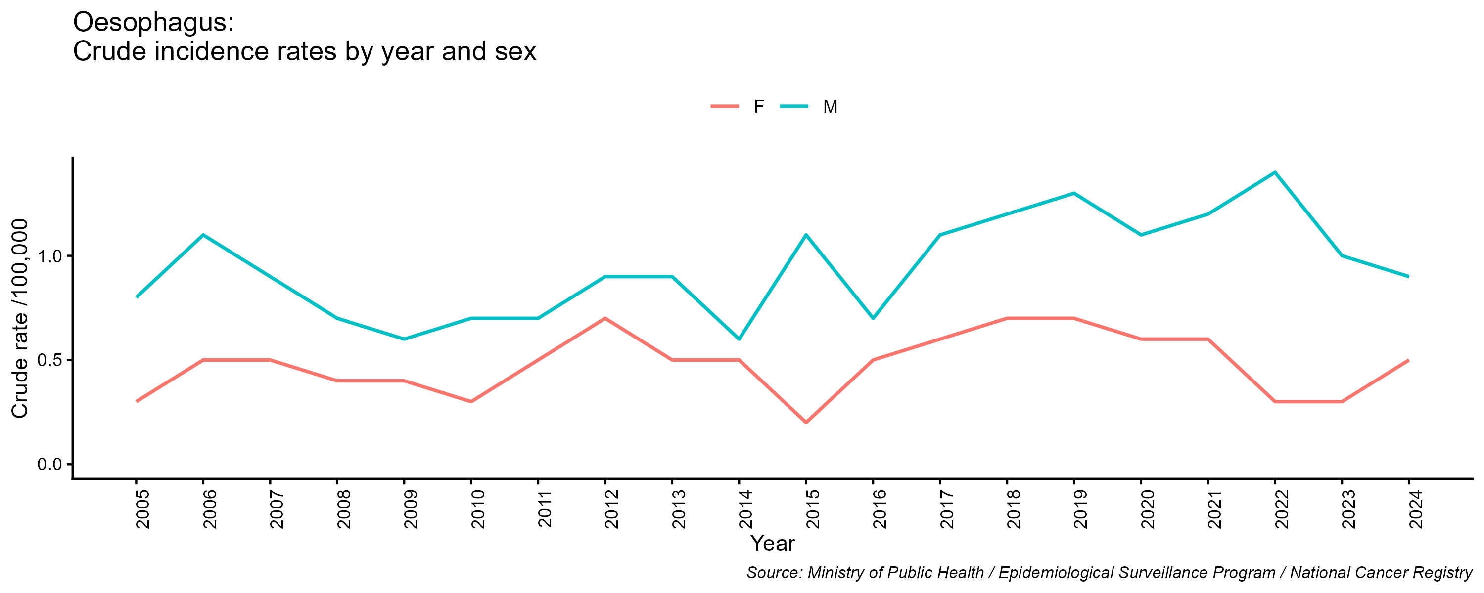 - Oesophagus cancer, crude incidence rate, by year and sex, 2005-2024