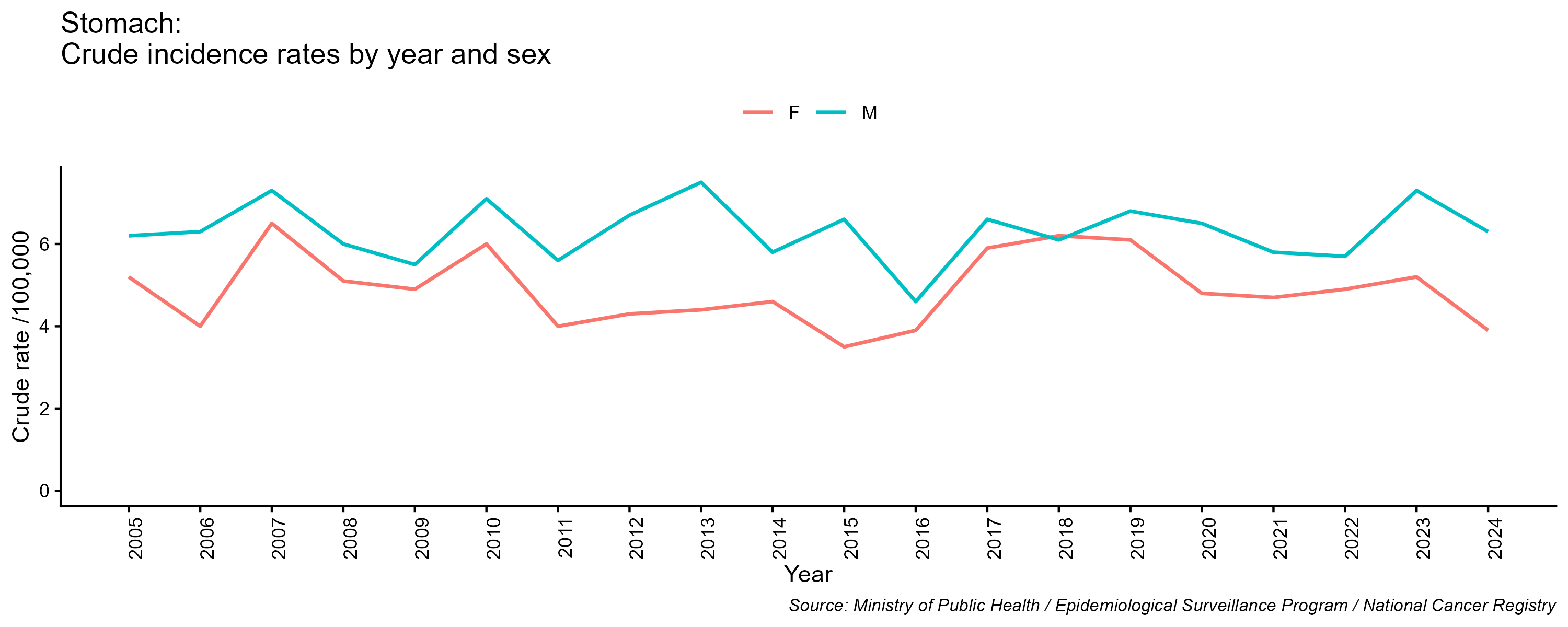 - Stomach cancer, crude incidence rate, by year and sex, 2005-2024