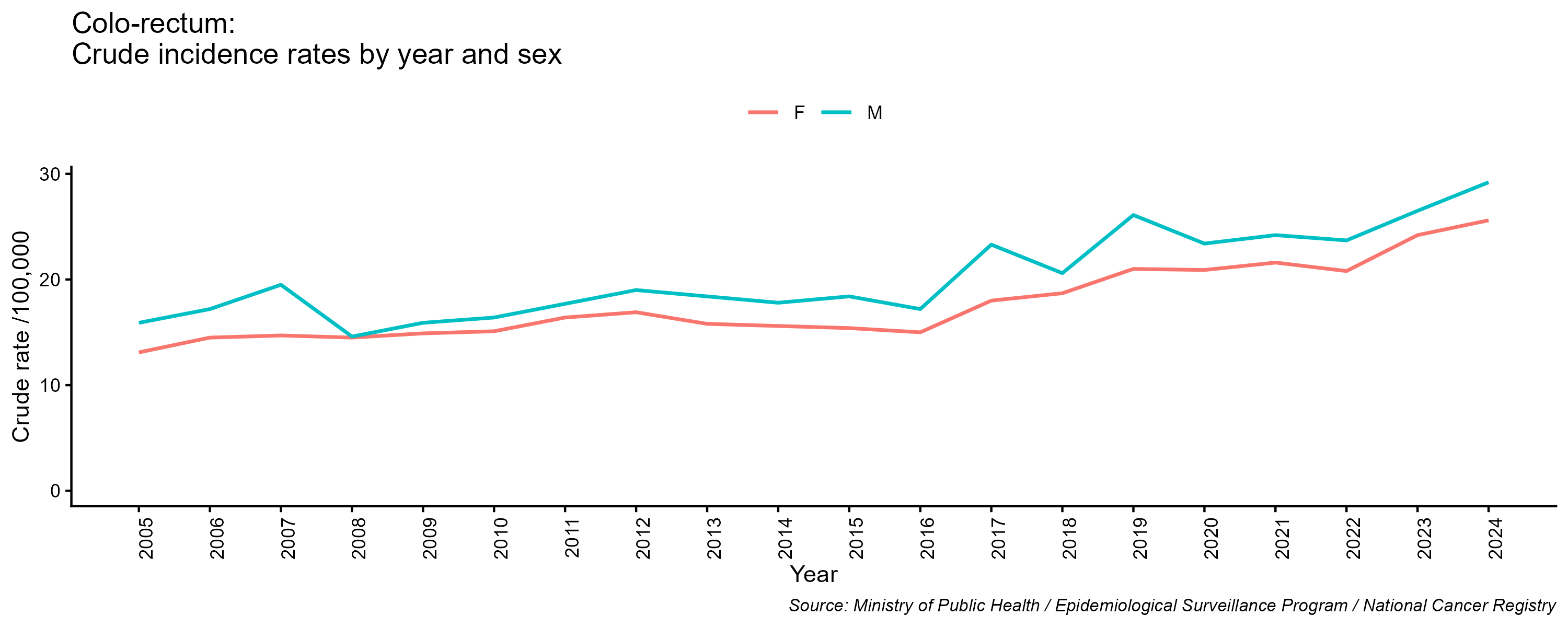 - Colo-rectal cancer, crude incidence rate, by year and sex, 2005-2024