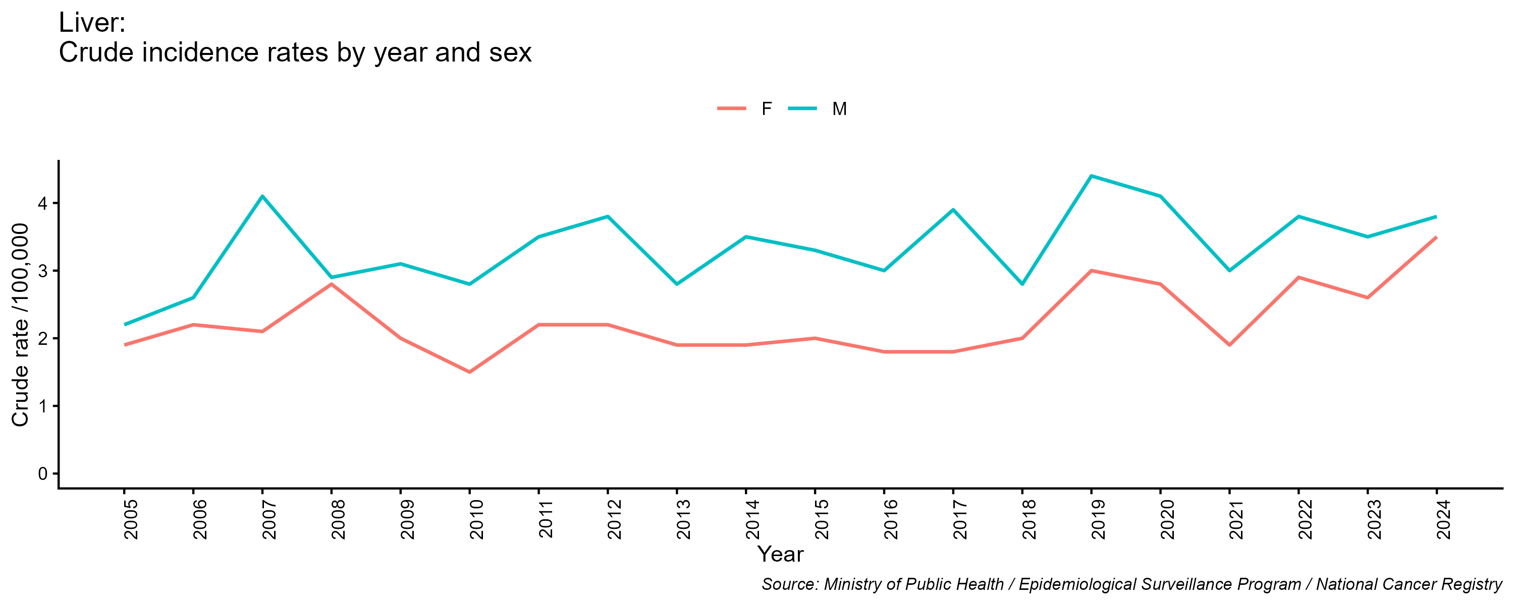 - Liver cancer, crude incidence rate, by year and sex, 2005-2024