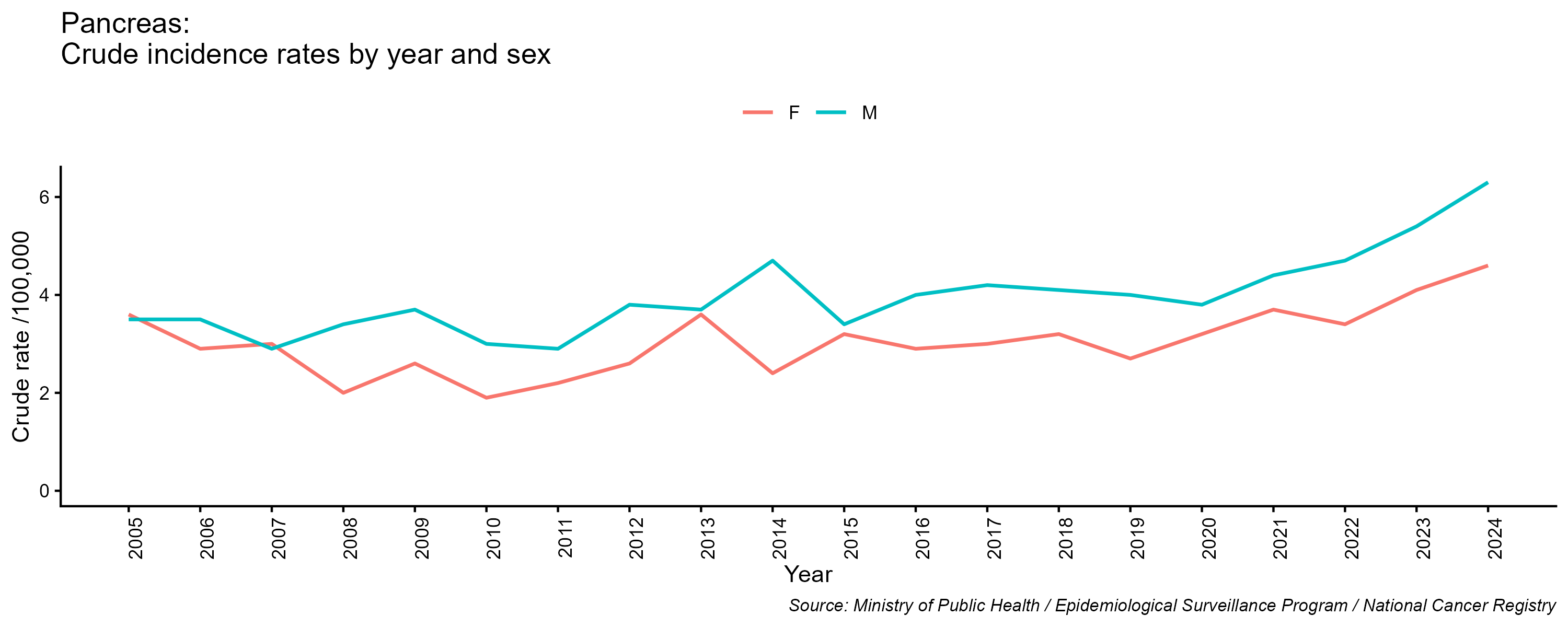 - Pancreas cancer, crude incidence rate, by year and sex, 2005-2024