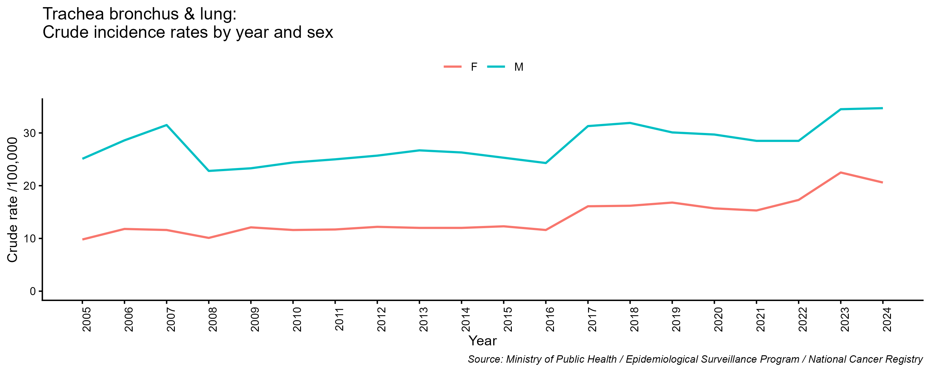 - Trachea-bronchus-lung cancer, crude incidence rate, by year and sex, 2005-2024