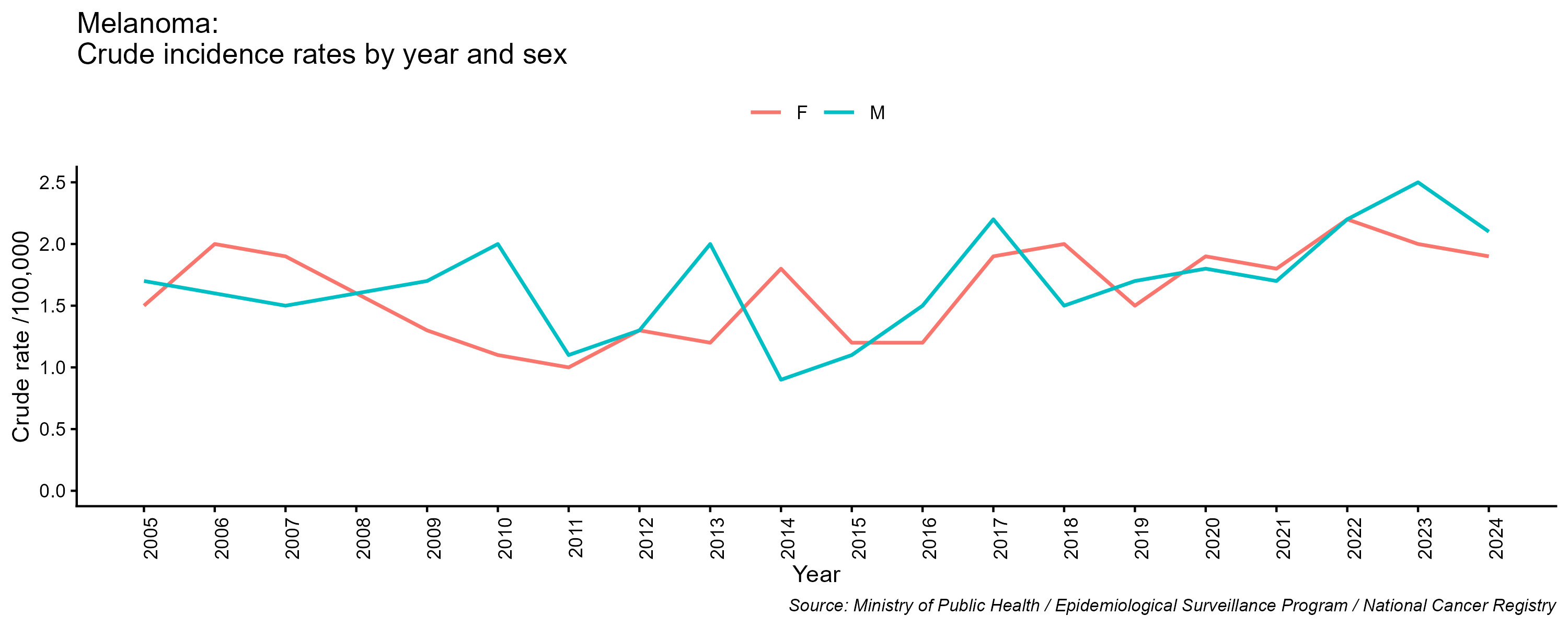 - Melanoma, crude incidence rate, by year and sex, 2005-2024
