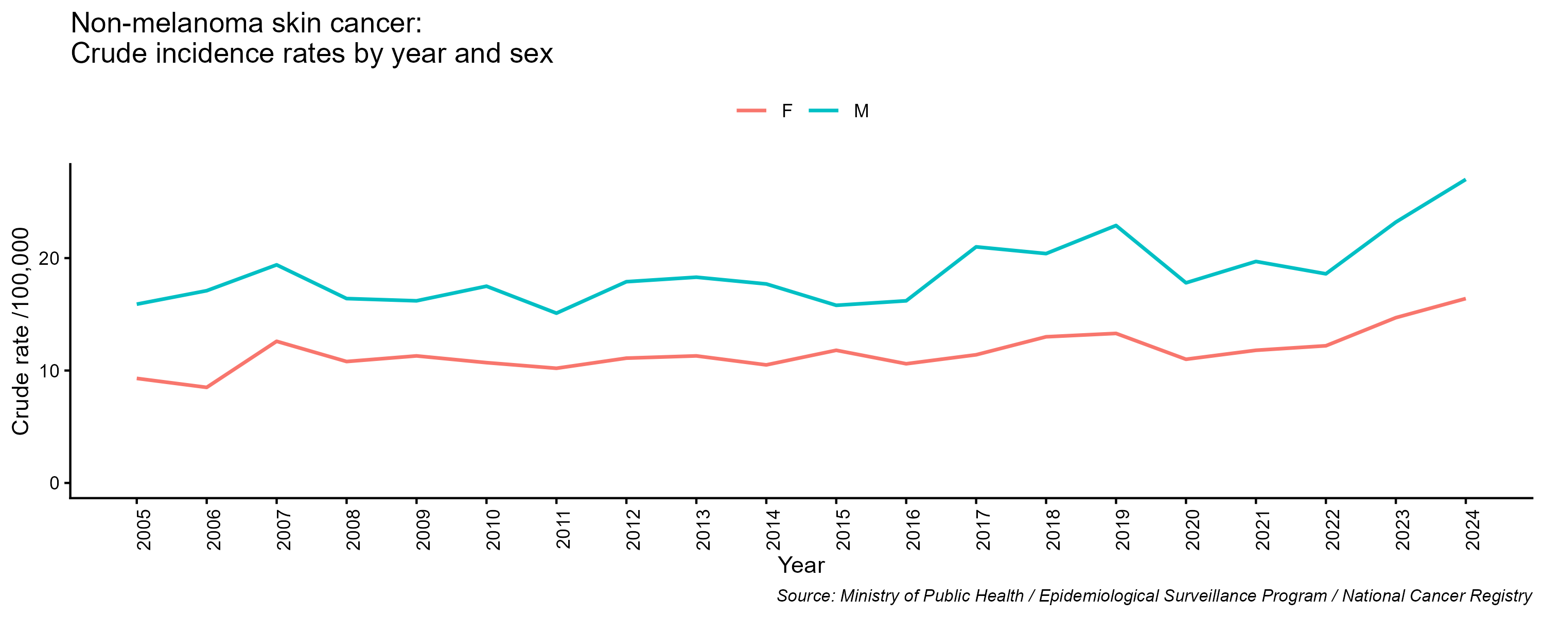 - Non-melanoma skin cancer, crude incidence rate, by year and sex, 2005-2024