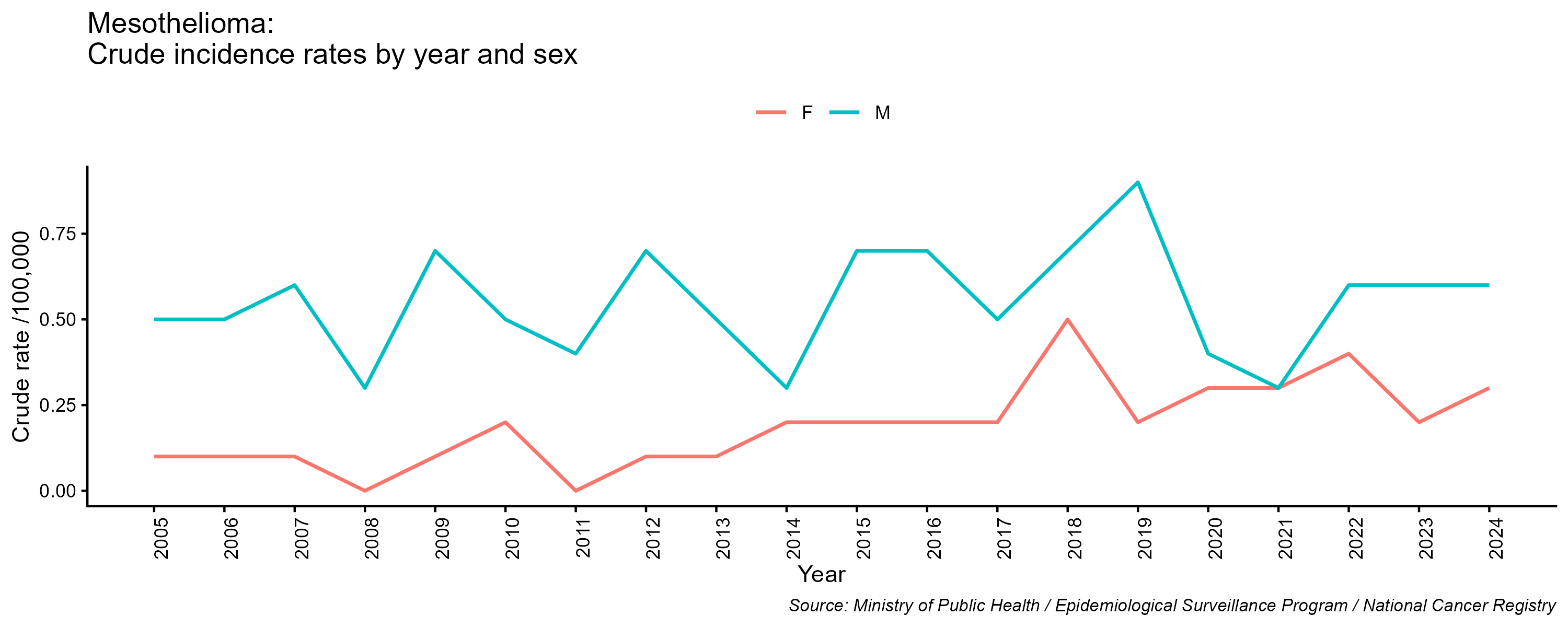 - Mesothelioma, crude incidence rate, by year and sex, 2005-2024