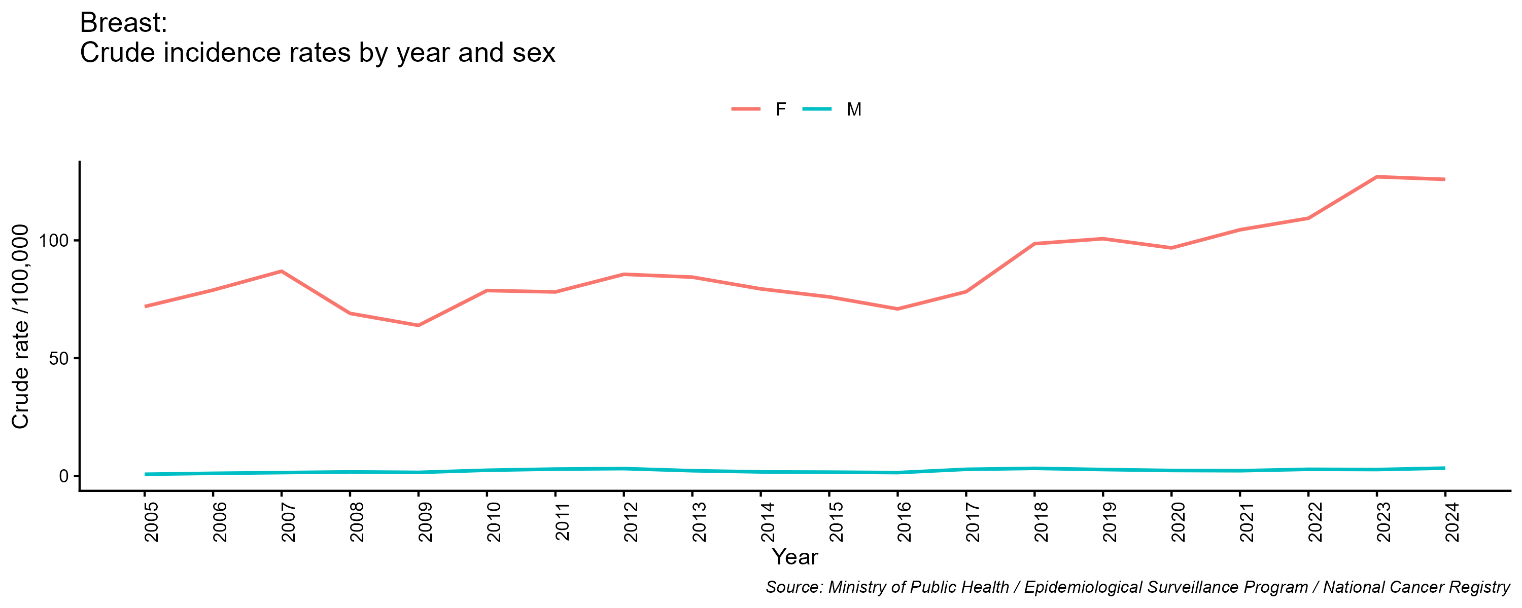 - Breast cancer, crude incidence rate, by year and sex, 2005-2024