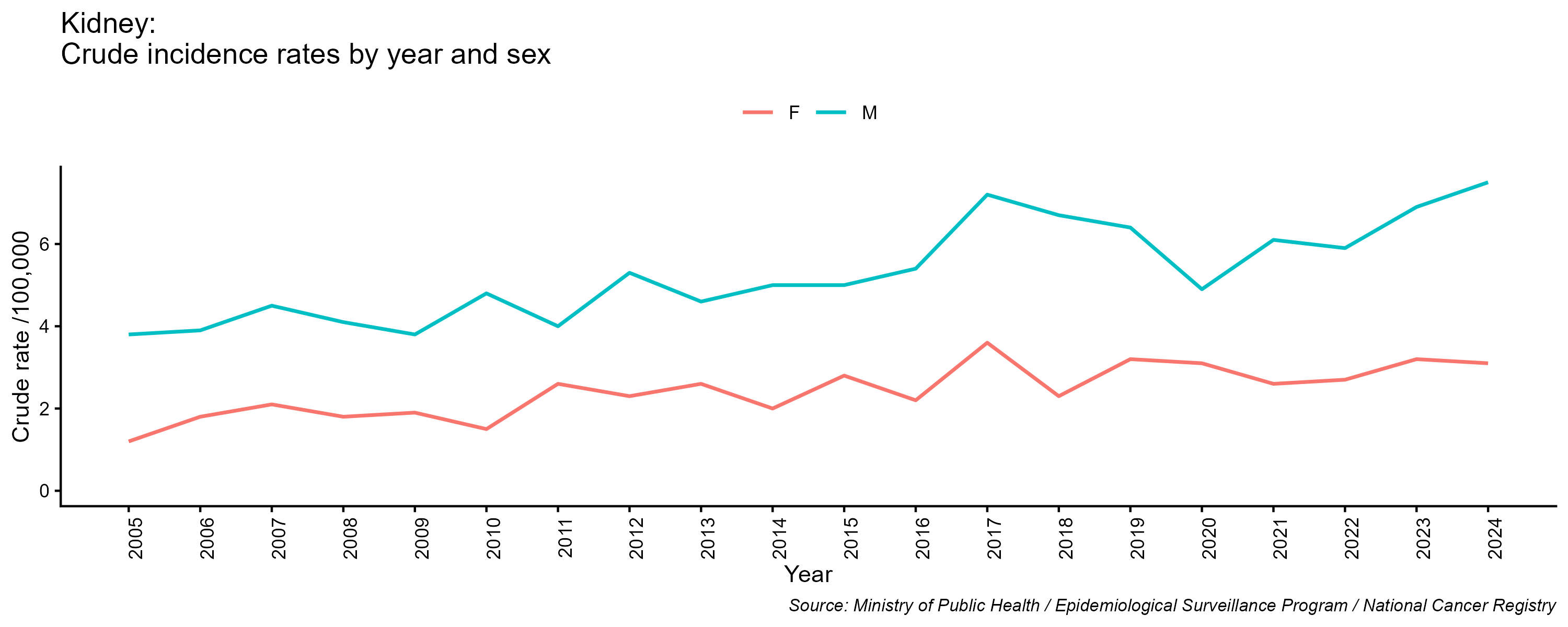 - Kidney cancer, crude incidence rate, by year and sex, 2005-2024