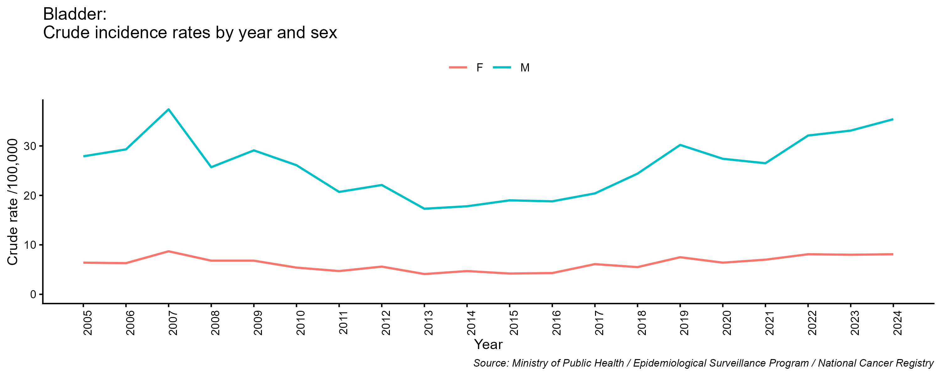 - Bladder cancer, crude incidence rate, by year and sex, 2005-2024