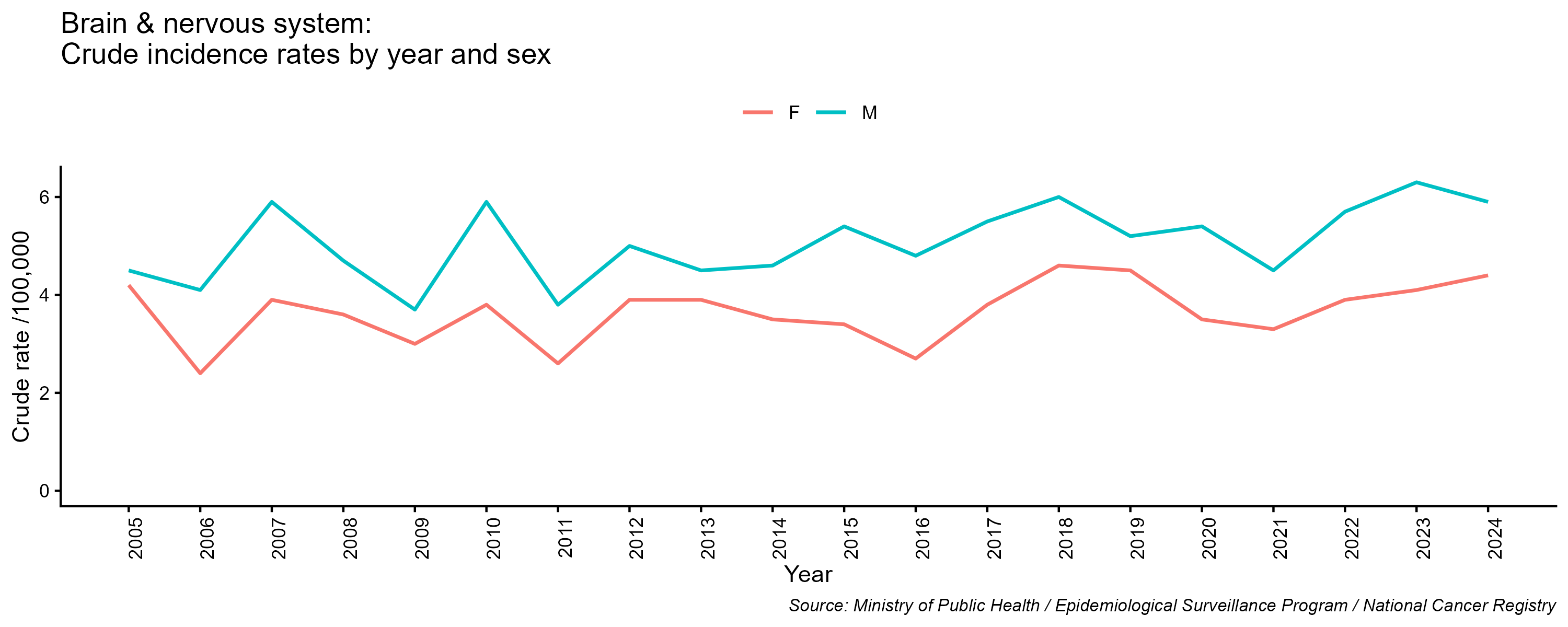 - Brain and central nervous system cancer, crude incidence rate, by year and sex, 2005-2024