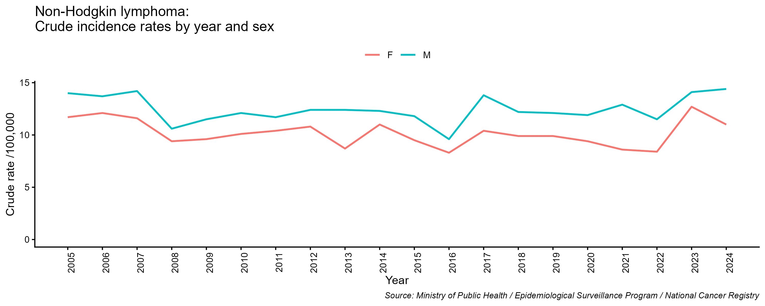 - Non-Hodgkin lymphoma, crude incidence rate, by year and sex, 2005-2024