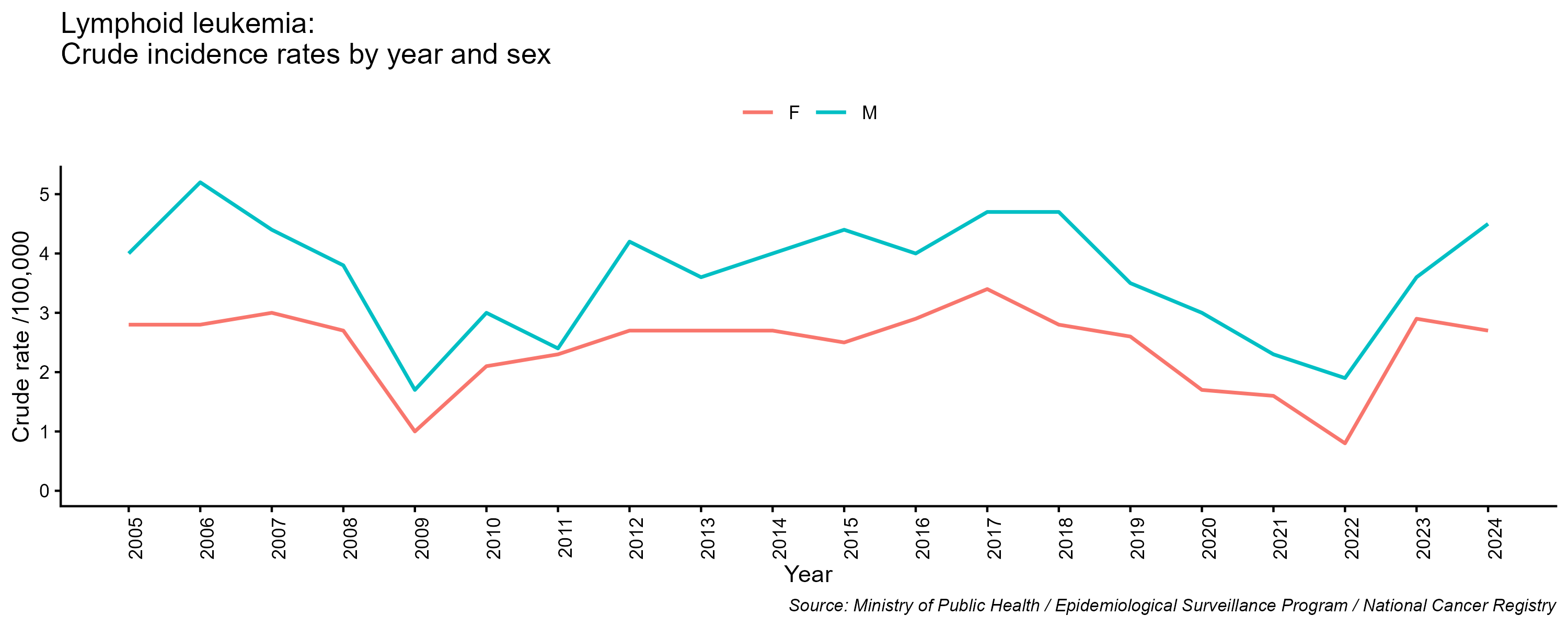 - Lymphoid leukemia, crude incidence rate, by year and sex, 2005-2024